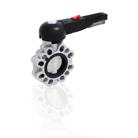 - Kilitleme ve kilit açma cihazı, serbest bırakma, hızlı çalıştırma ve 10 ara pozisyonda (DN 40÷200) kademeli ayarlama ile donatılmış HIPVC’den yapılmış ergonomik sap . Vana açılışının ilk birkaç derecesinden başlayan çalışma aralığı ayrıca son derece düşük basınç düşüşlerini garanti eder .