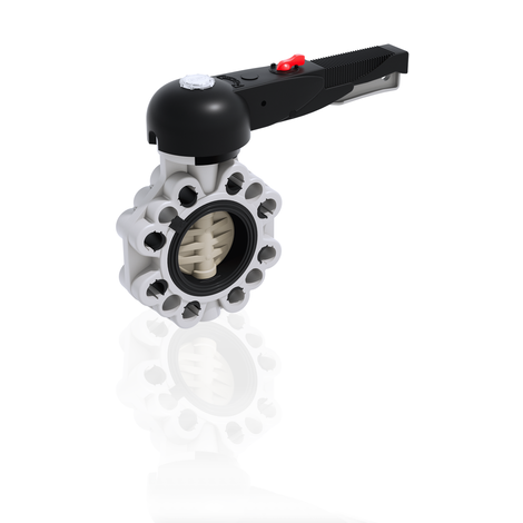 - Kilitleme ve kilit açma cihazı, serbest bırakma, hızlı çalıştırma ve 10 ara pozisyonda (DN 40÷200) kademeli ayarlama ile donatılmış HIPVC’den yapılmış ergonomik sap . Vana açılışının ilk birkaç derecesinden başlayan çalışma aralığı ayrıca son derece düşük basınç düşüşlerini garanti eder .